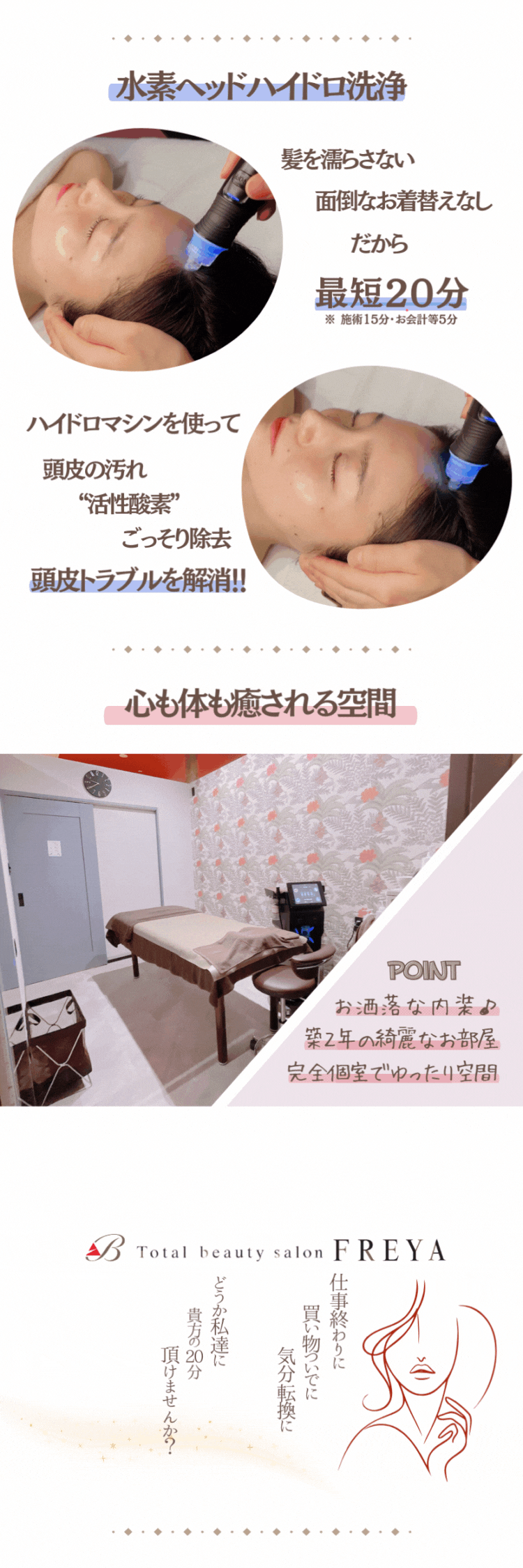 ヘッドスパの水素水の不思議な感覚や、水素水のお話しがとても楽しかったです。ヘッドスパもとても心地よく、寝てしまいました。終わった後はとてもスッキリです!