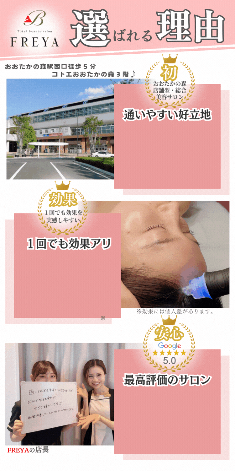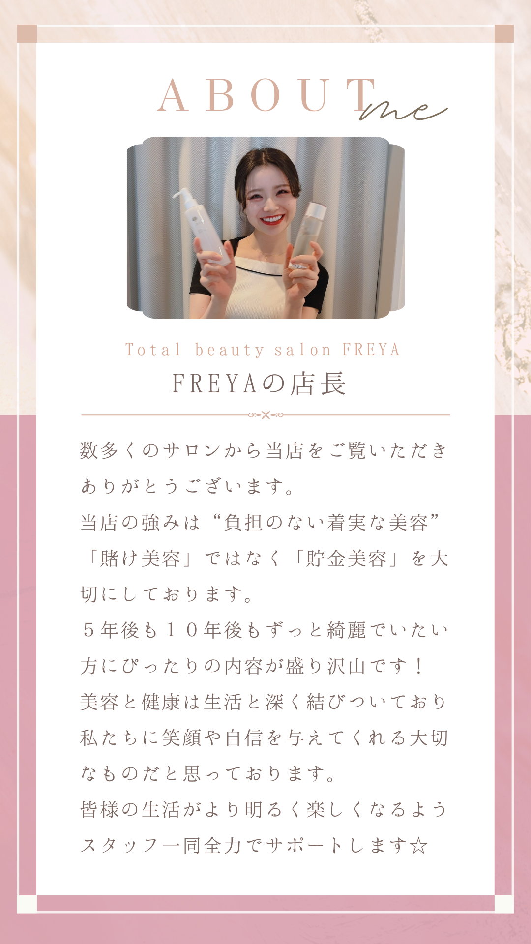またFREYAのエステティシャンは、技術だけでなく、美容・健康の知識も豊富です。お客様の様々なお悩み・疑問をお伺いし、”美容のプロ”が一緒に解決のお手伝いをさせて頂きます。